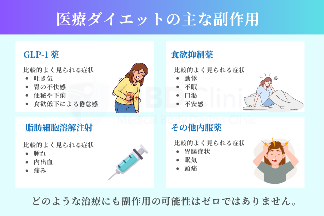 医療ダイエット薬(GLP-1受容体作動薬やSGLT2阻害薬など)は、稀に吐き気、胃の不快感、便秘などの症状が出ることがあります。