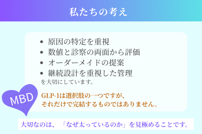 GLP-1(マンジャロ)は選択肢の一つですが、 それだけで完結するものではありません。